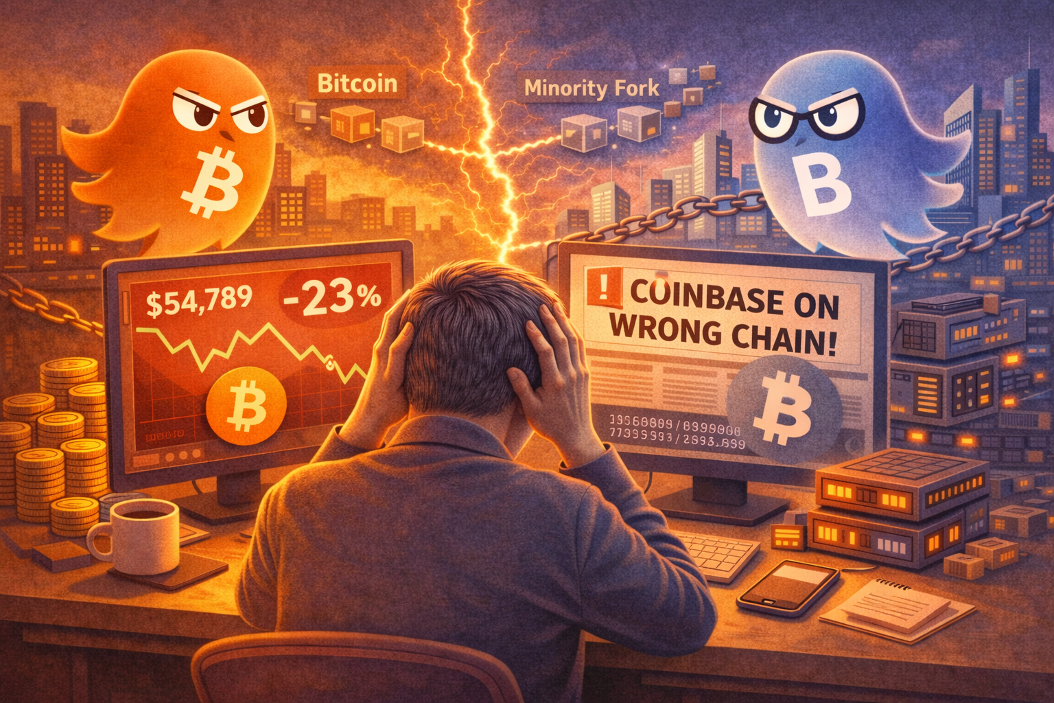 Bitcoin’s value has just dropped by 23%. You stare at the screen, trying to convince yourself it’s a glitch. You refresh the page, but the numbers stay the same, red and unforgiving. Then you come across a piece of news that freezes your blood: Coinbase is holding bitcoins on the wrong chain, a minority branch of the blockchain created after a hard fork. The 23% drop applies to the “real” Bitcoin, but not to the one you own. What you believed was your Bitcoin has just become an almost worthless digital shadow. You were planning to retire next week, and now you realize your savings didn’t merely lose part of their value; they have turned into a string of numbers nobody cares about anymore.