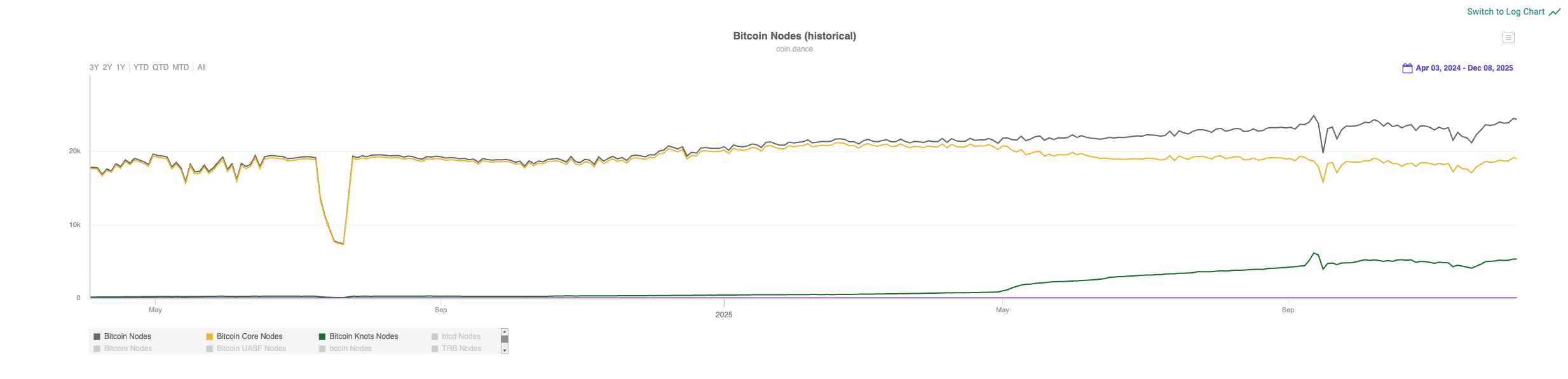 If we look at what is happening today with Bitcoin and the software that runs its nodes, one trend becomes increasingly clear: the number of operators using alternative implementations is growing rapidly. In absolute terms, their share remains relatively modest, at around 20%, but the pace of change is striking. The number of nodes running alternatives to Bitcoin Core rose from roughly 250 in the summer of 2024 to approximately 5,400 by February 2025, according to data from services such as coin.dance and Bitnodes.